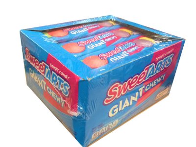 Candy, Sweet Tarts, Giant Chewy contains: Dextrose, Corn Syrup, Hydrogenated Coconut Oil, Malic Acid, Maltodextrin, and Less than 2% of Calcium Stearate, Egg Albumen, Artificial Flavors, Mono- and Diglycerides, Blue one Lake, Blue two Lake, Red forty Lake, Yellow five Lake.